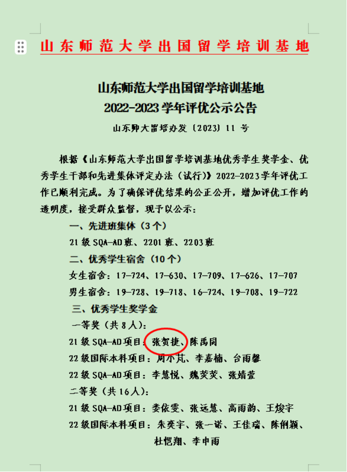山东师范大学出国留学培训基地采用国内、国外分阶段学习模式,课程设置整合国内外标准。在山师,英语学习与通识学分课程学习同步进行,获得合格的语言成绩同时,又可获得国外大学学分豁免。在山师留培基地的学习为张贺捷构建了扎实的知识体系,也成为他名校之路的“敲门砖”。
