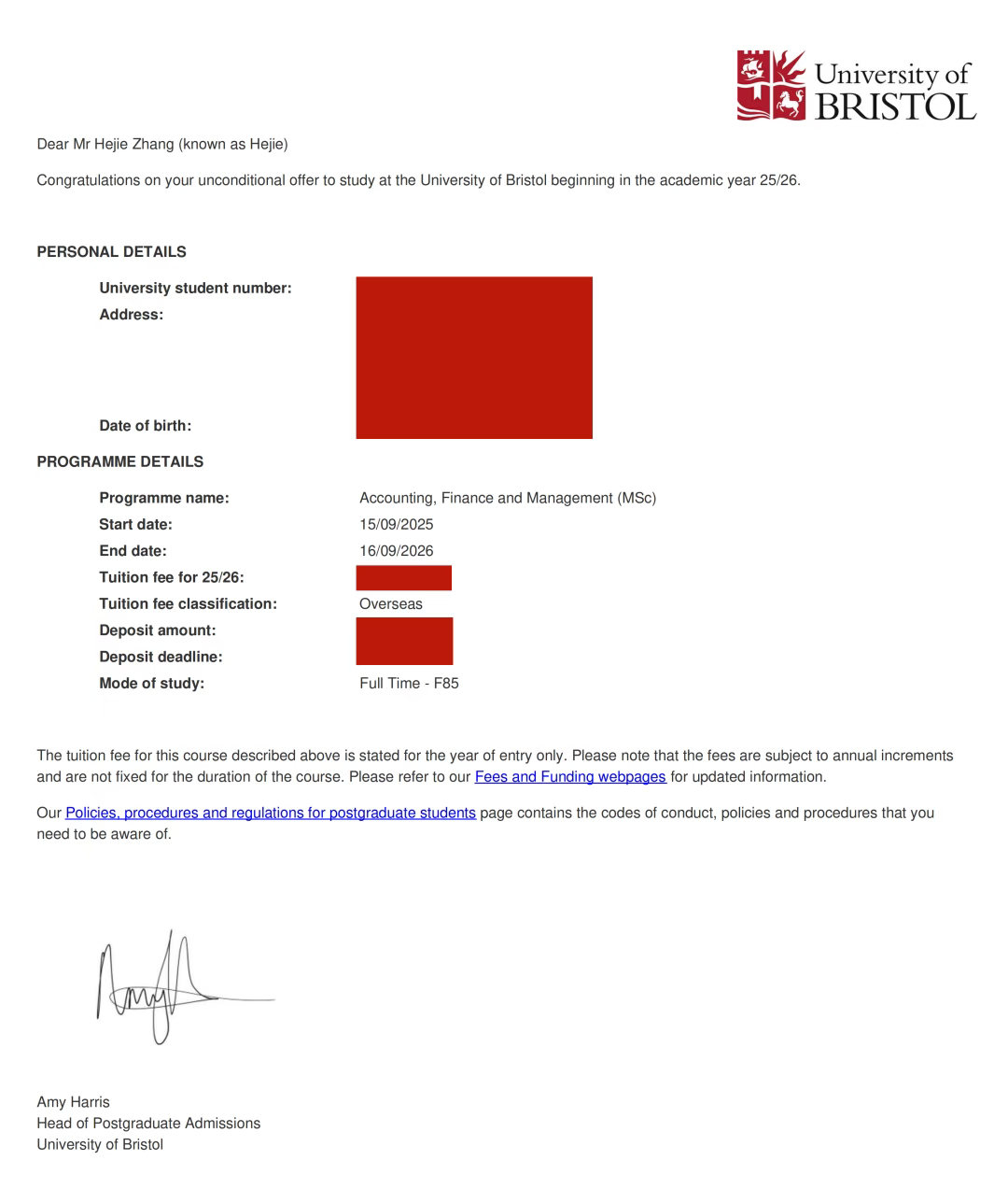 张贺捷布里斯托大学 Offer