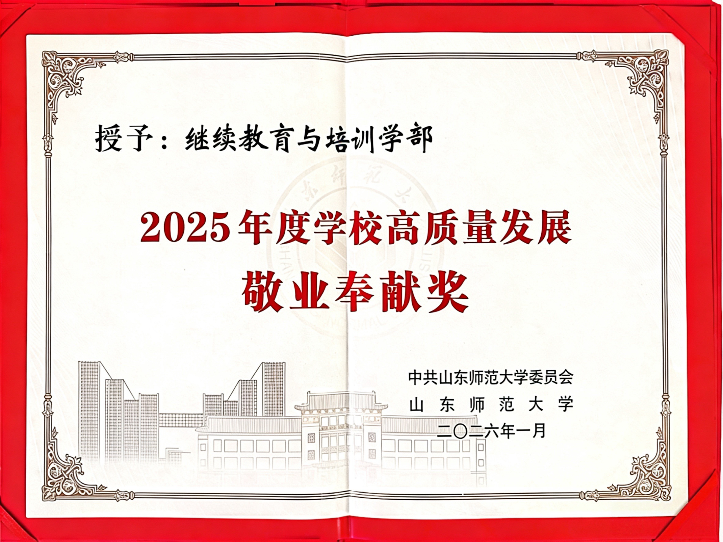 2月1日,山东师范大学召开2025年度高质量发展总结表彰大会,继续教育与培训学部荣获“2025年度学校高质量发展敬业奉献奖”。