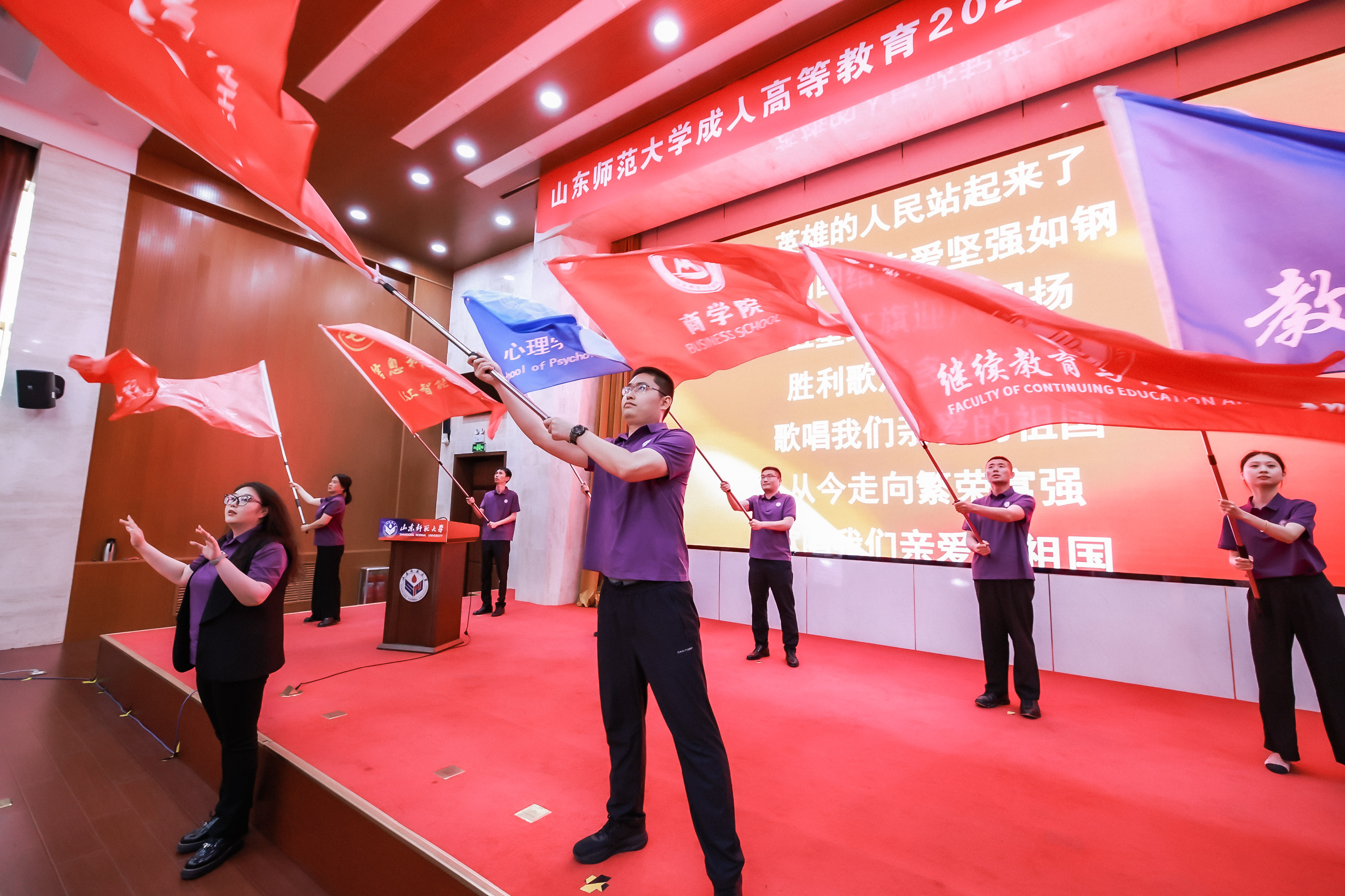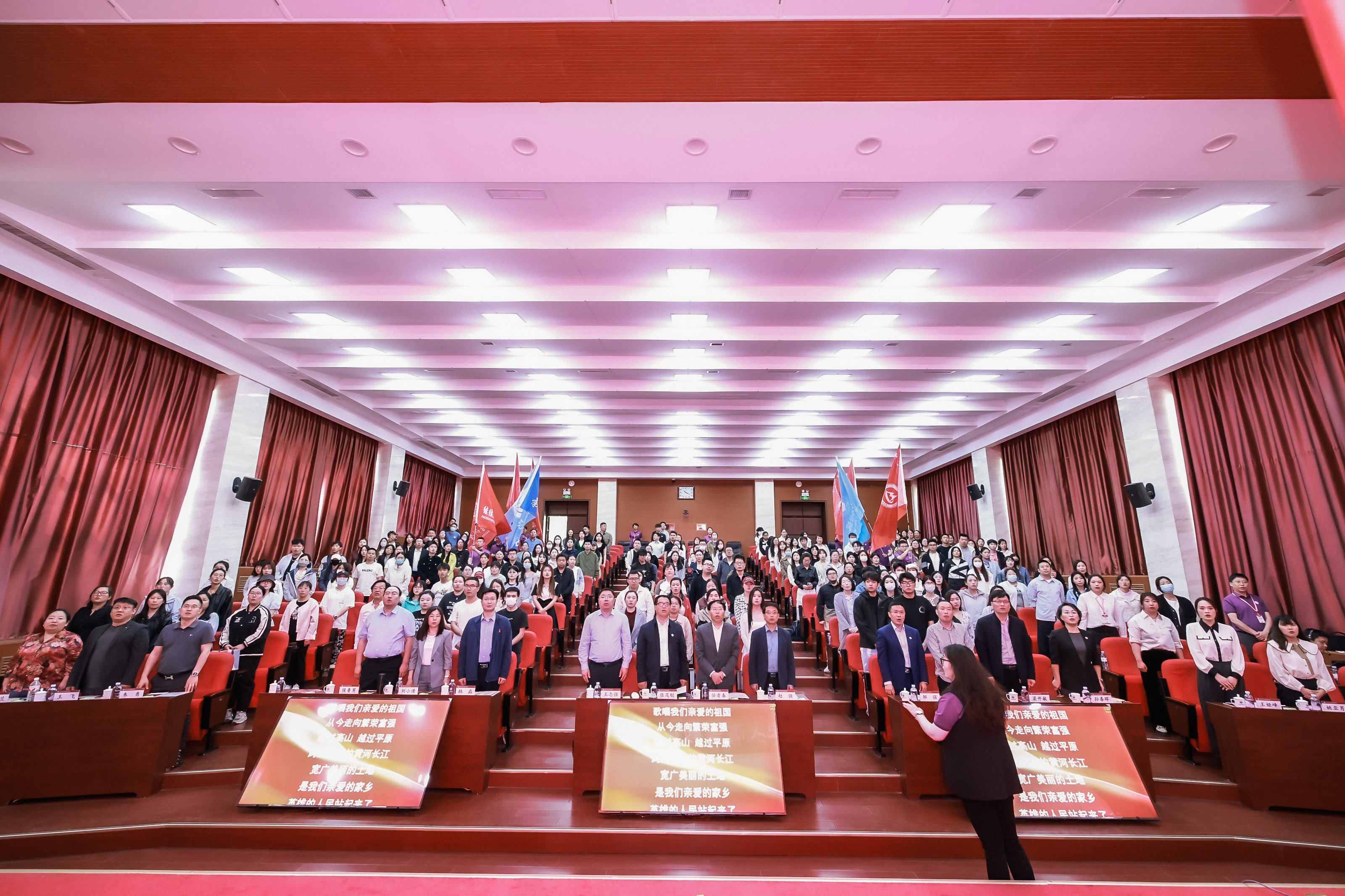 典礼临近尾声,与会人员齐声高唱《歌唱祖国》,在激昂的旋律中,学部教工代表手持校旗与各教学科研单位院(部)旗随乐挥动,将现场氛围推向高潮。