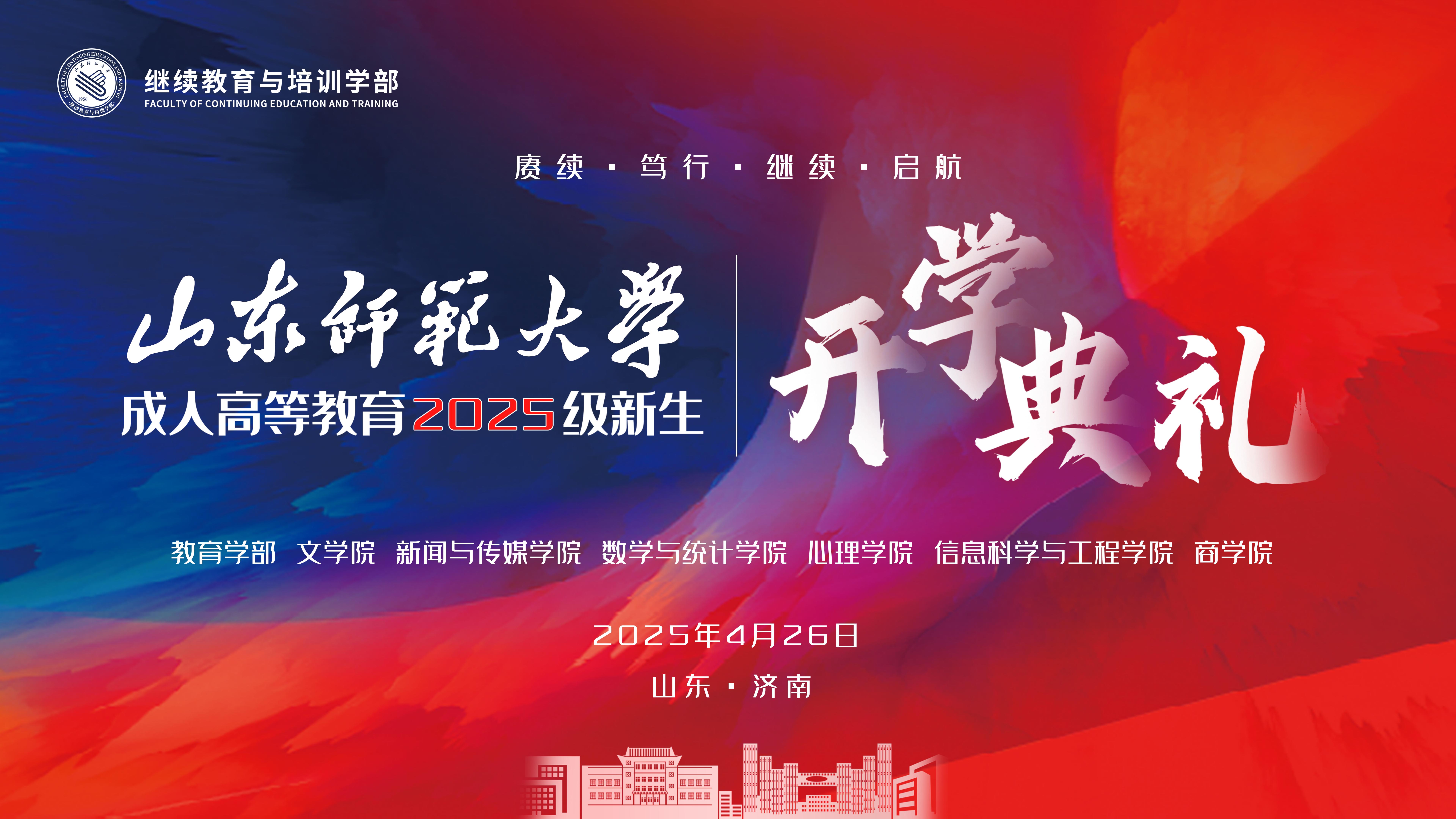 4月26日,山东师范大学成人高等教育2025级新生开学典礼在千佛山校区教学三楼报告厅举行,并在线上同步云直播。副校长张茂聪出席活动并讲话。学校相关教学科研单位负责同志、继续教育与培训学部领导班子成员、相关部室负责人和工作人员,15地市的19个校外教学点负责同志、2025级新生在现场和线上参加活动。典礼由学部部长孙春晖主持。