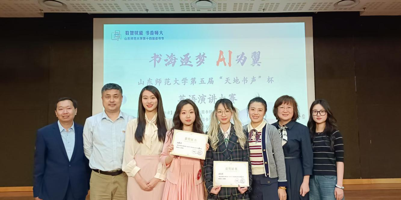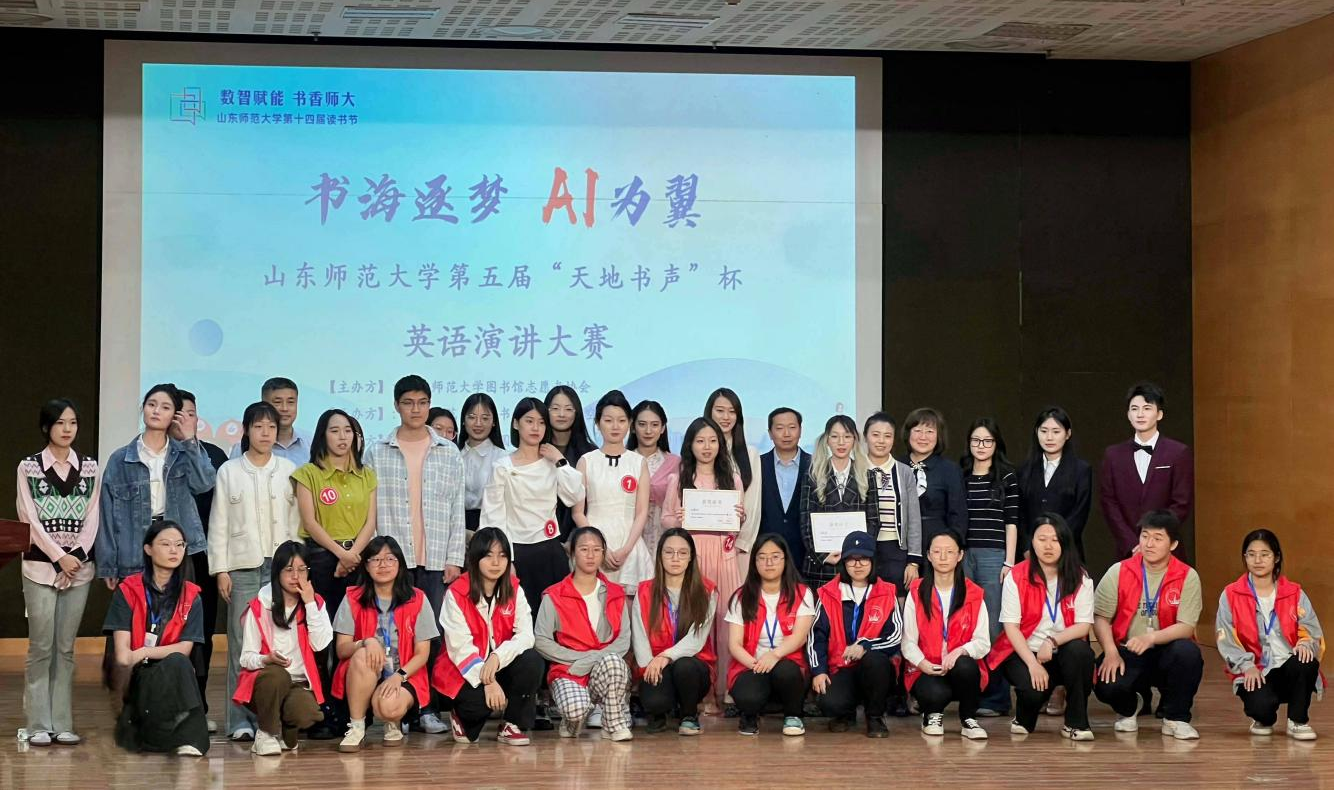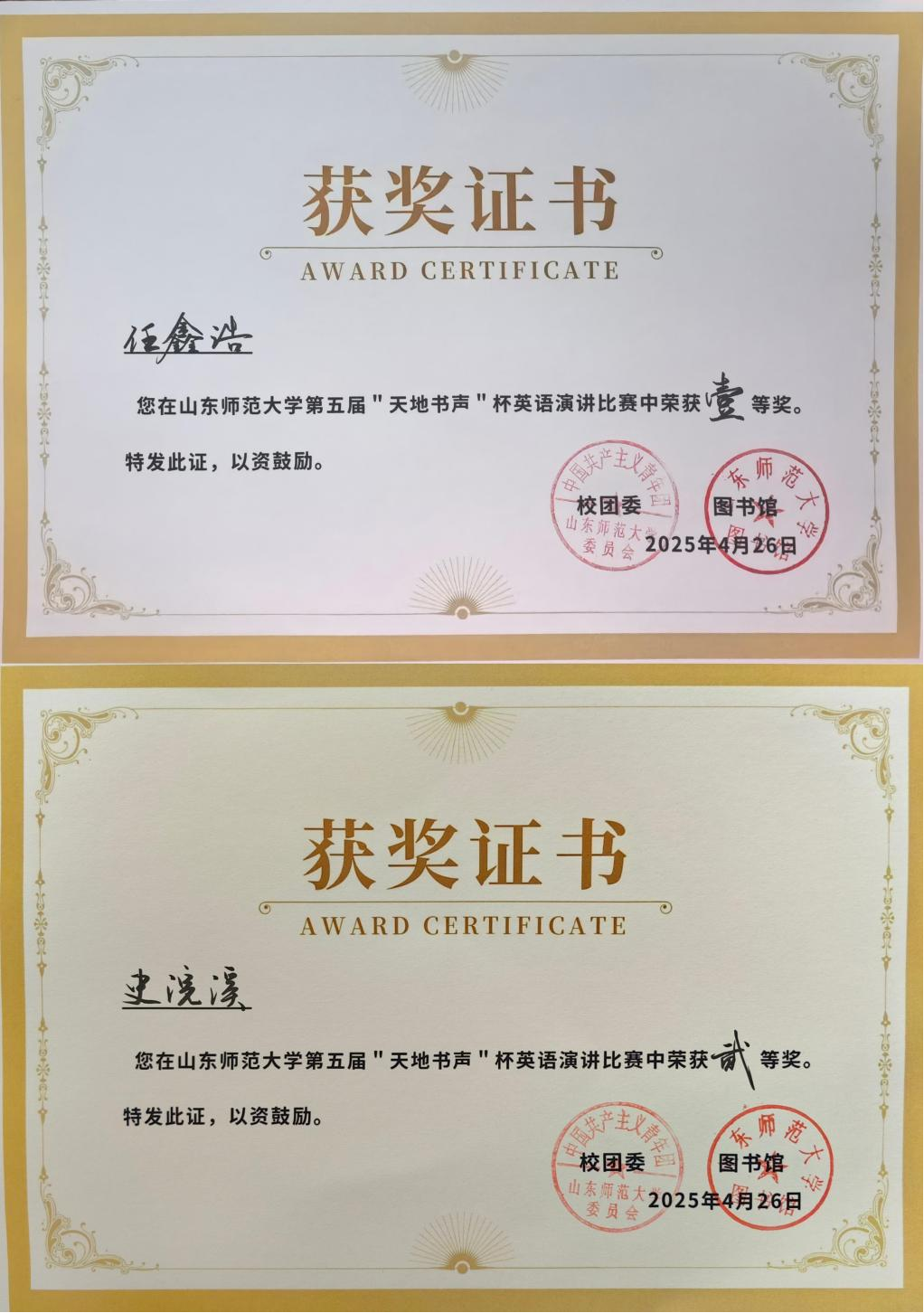 4月26日,山东师范大学图书馆“书海逐梦,AI为翼”第五届“天地书声”杯英语演讲大赛圆满落幕。在这场科技与人文交融的演讲比赛中,学校出国留学培训基地学生任鑫浩、史浣溪成功晋级决赛,并分别荣获一等奖、二等奖。