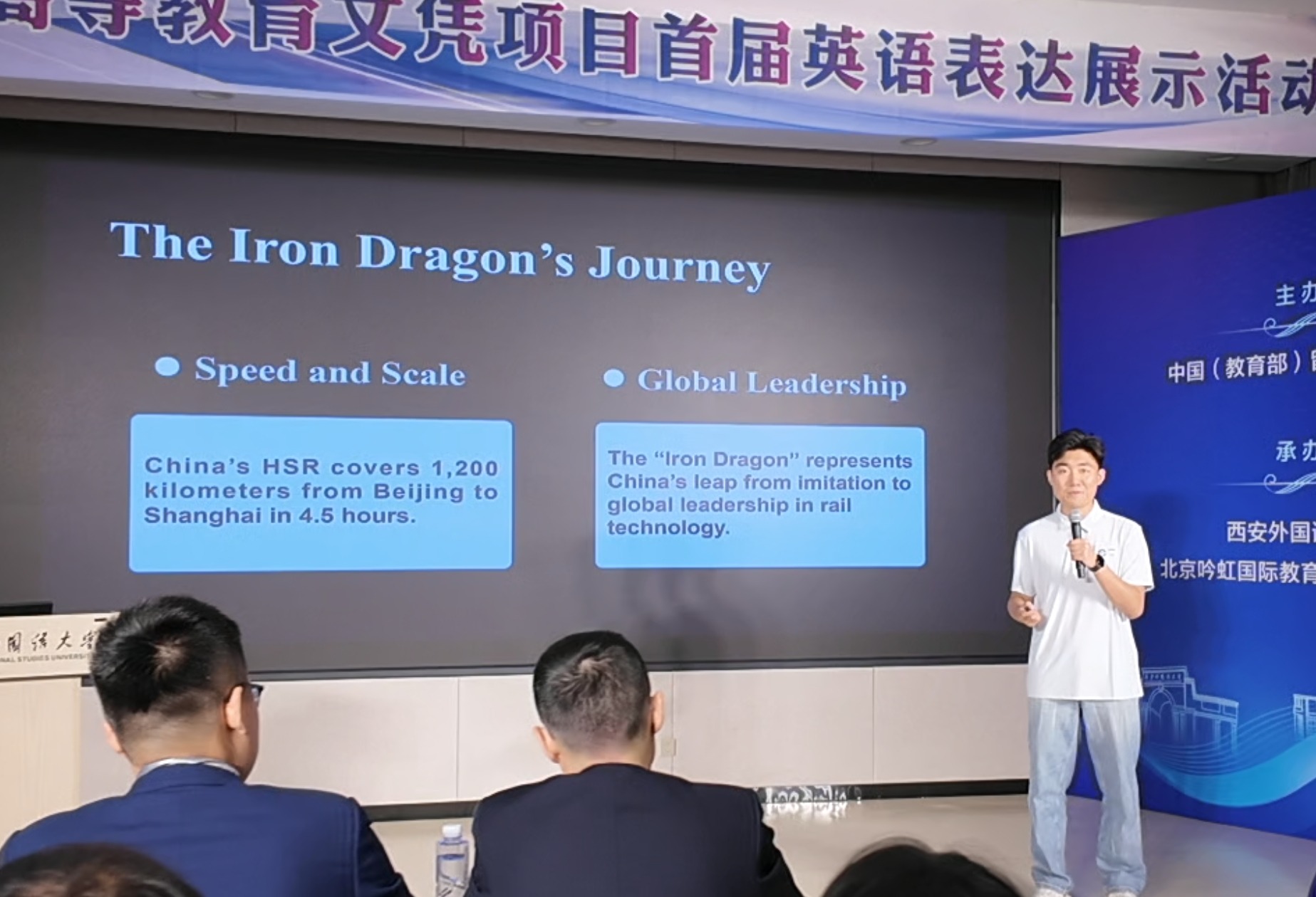 项目2023级学生刘宇航,以其富有洞见的视角,带领观众穿越中国高铁的时光长廊,介绍了中国高铁的每一次进化都凝结着当代科技文明的璀璨结晶。他凭借其流畅的表达、独到的见解与沉稳的台风,赢得了评委们的一致赞誉。
