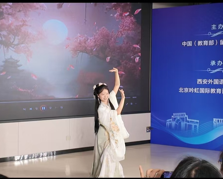 项目2024级学生高雨菡以一袭汉服为时光之梭,讲述了华夏五千年历史文化的发展变化。在才艺展示环节中,她通过中国舞的写意身段,恰似“翠微匎叶垂鬓唇,珠压腰衱稳称身”的立体诗行。让观众真切感受到汉服不仅是衣裳,更是流动的文化、传承的美学,其新颖的表达形式获得评委的高度评价。