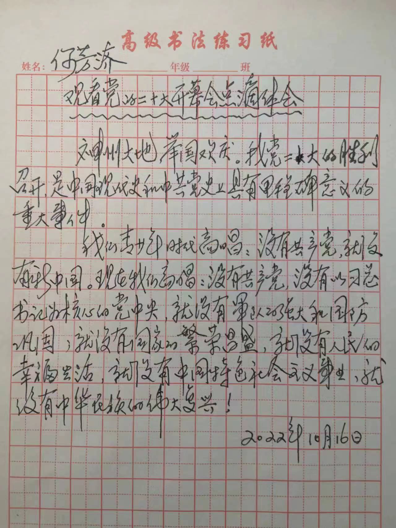 学部第二教工党支部书记、出国留学培训基地韩道广:二十大报告主题特别鲜明、内容特别全面、新意特别突出。从二十大报告中,我理解到党在新征程上与道路与方向,进一步明确了党在政治、经济、文化、社会、生态等方面建成社会主义现代化强国两步走战略安排与宏伟构想。更加深刻认识到,我们要实现中国的现代化发展和民族的伟大复兴,必须要在党的领导下,以人为本,以科技为先,实干兴邦,立足本职,做好“为党育人,为国育才”工作。