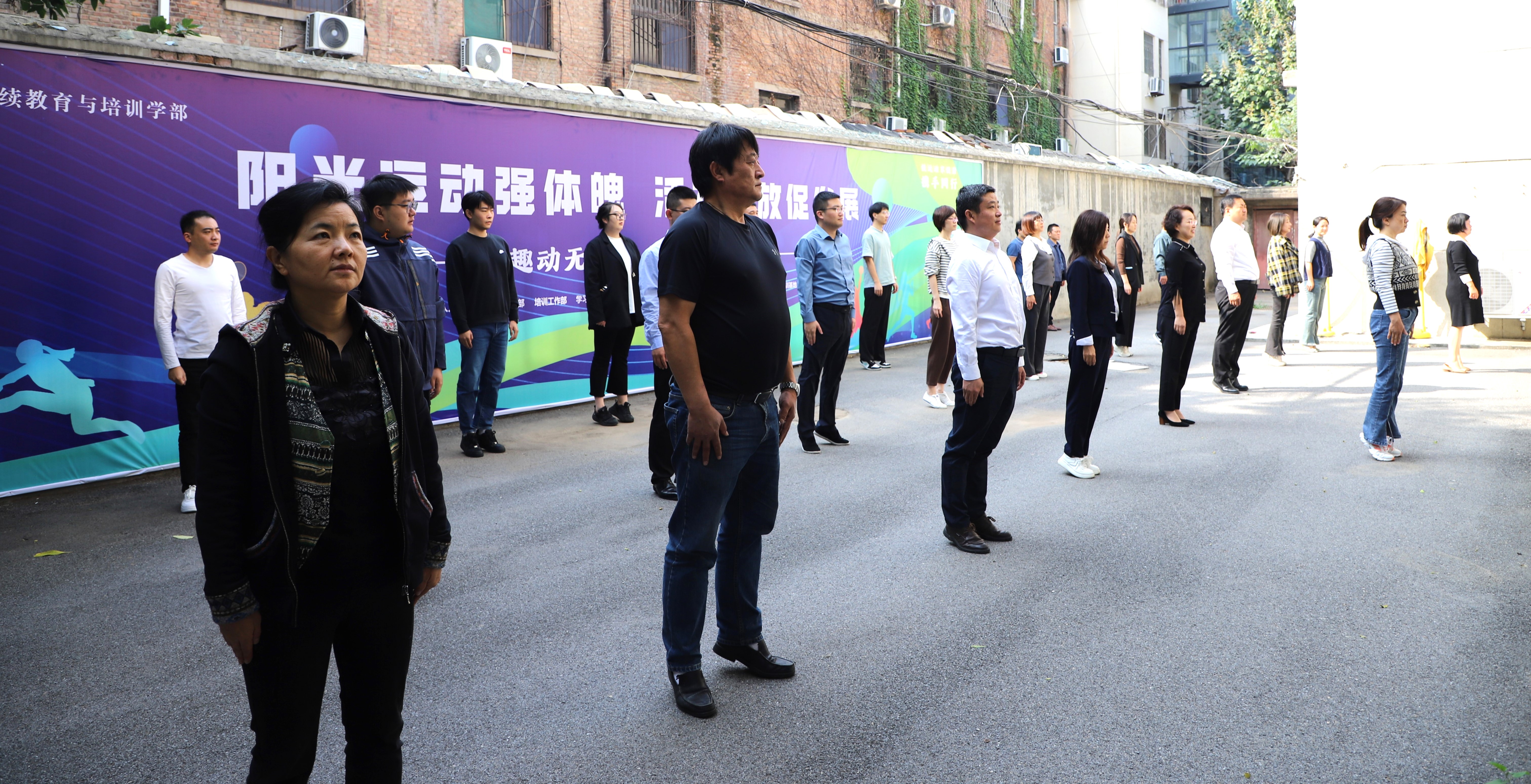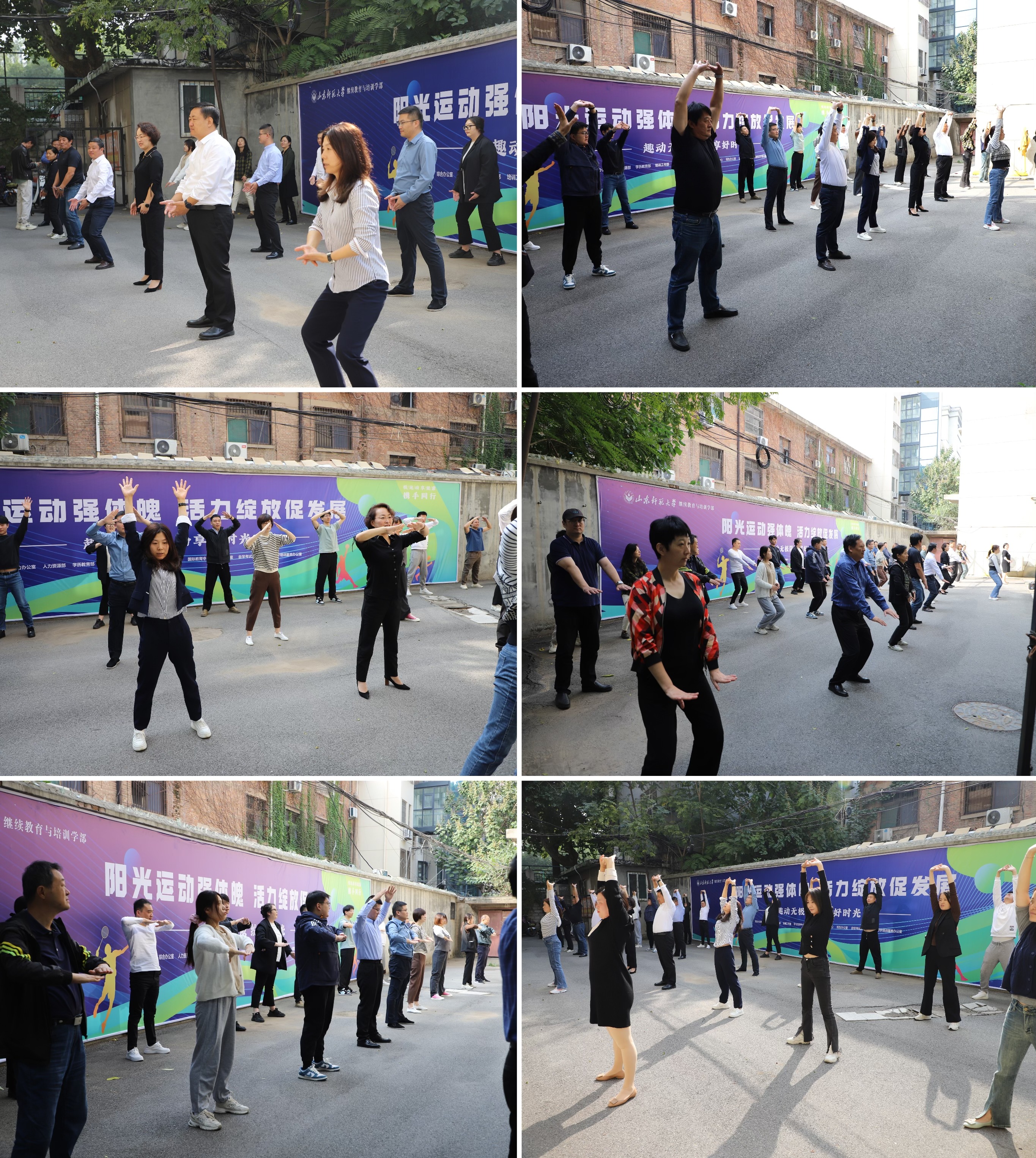 为提高教职工身体素质,丰富文体生活,营造积极向上、团结和谐的工作氛围,自10月 16日起,继续教育培训学部持续开展 “快乐工作,健康生活”阳光健身工间操活动,每天上午10点,大家走出办公室到文汇楼南侧小院集合,跟随领操员一起练习健身操。